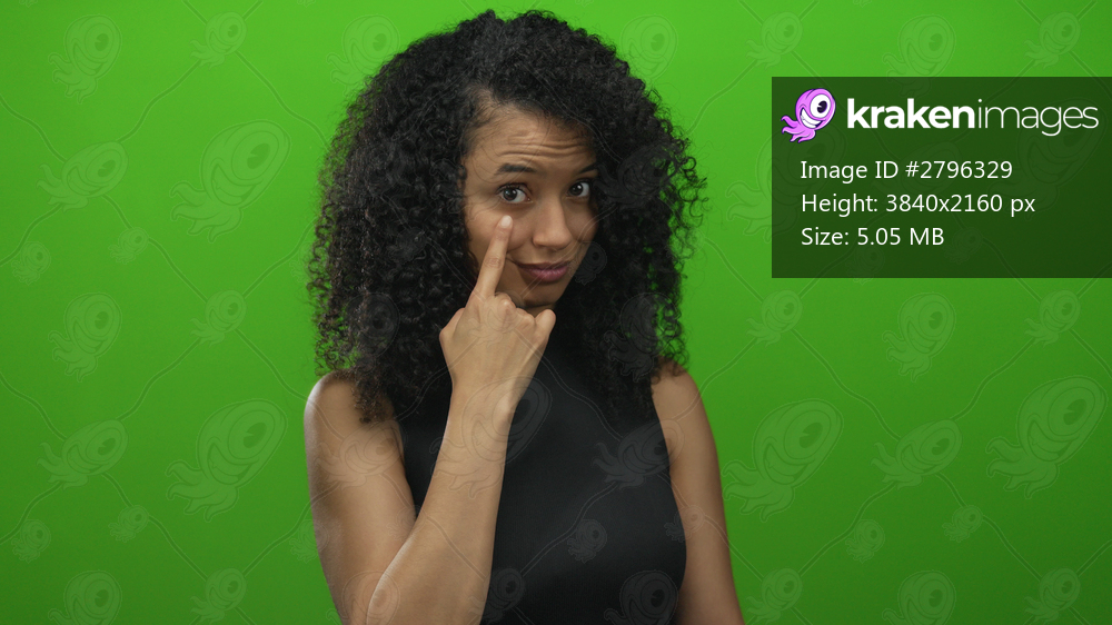 Woman gestures thoughtfully against a vibrant green background, conveying emotion and expression.