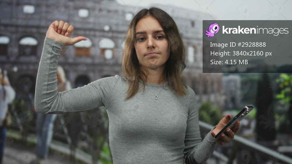 Woman gestures thumb back at colosseum building while holding smartphone and wearing heart necklace; mild indifference.