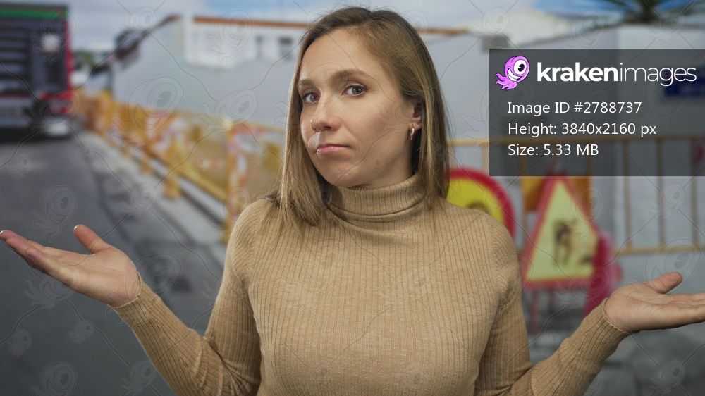 Woman gestures with uncertainty at a construction site wearing a beige sweater surrounded by road signs and barriers in an outdoor environment.