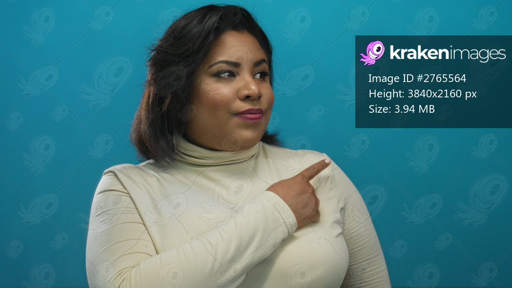 Woman gestures while pointing in various directions over a vibrant blue background highlighting choice and decision.