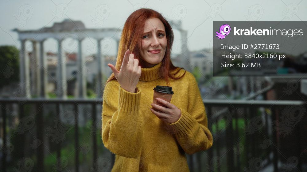 Woman gesturing with a coffee cup in hand, standing at roman ruins with red hair and wearing a sweater, expressing emotion in an ancient city setting outdoors. - Kraken Images