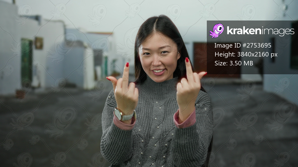 Woman gesturing with a smile in an urban street setting, showcasing youthful energy and confidence in casual outdoor attire.