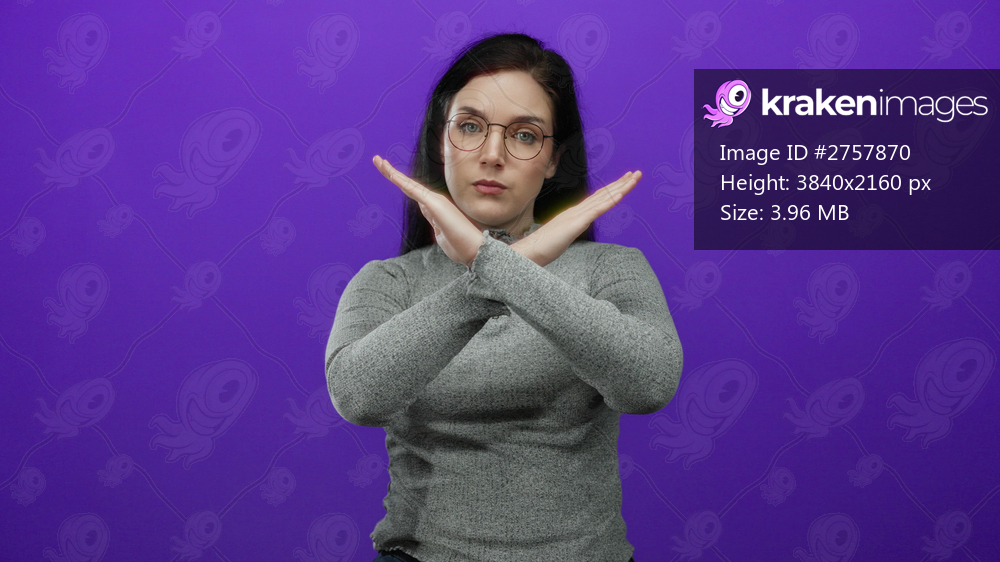 Woman gesturing against vibrant purple background wearing glasses and gray top conveys nonverbal communication with expressions of disapproval and focus. - Kraken Images