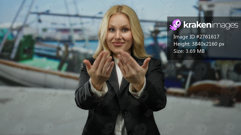 Woman gesturing at a bustling port with boats in the background, wearing a suit, blonde hair, smiling, outdoor scene by the sea, indicating in a lively maritime environment. - Kraken Images