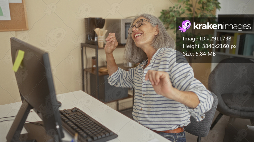 Woman gesturing at computer in an office building while smiling and moving hands toward the monitor; connection happiness.