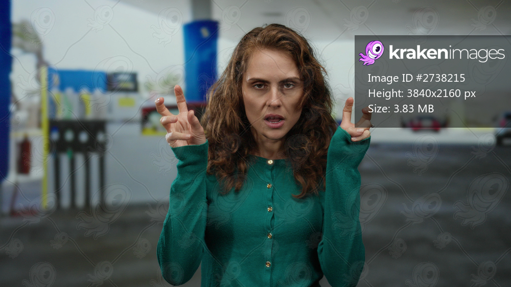 Woman gesturing at petrol station, showcasing expressive emotions and casual style in an outdoor setting with blurred fuel pumps in the background.