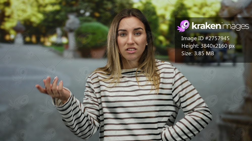 Woman gesturing with blonde hair wearing striped shirt in park setting, surrounded by lush greenery and sculptures while looking thoughtful in an outdoor environment. - Kraken Images