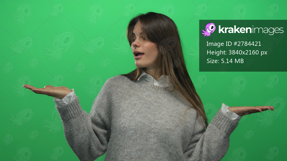 Woman gesturing with both hands against a vivid green background, wearing a gray sweater and exhibiting a thoughtful expression, isolated in a studio setting. - Kraken Images