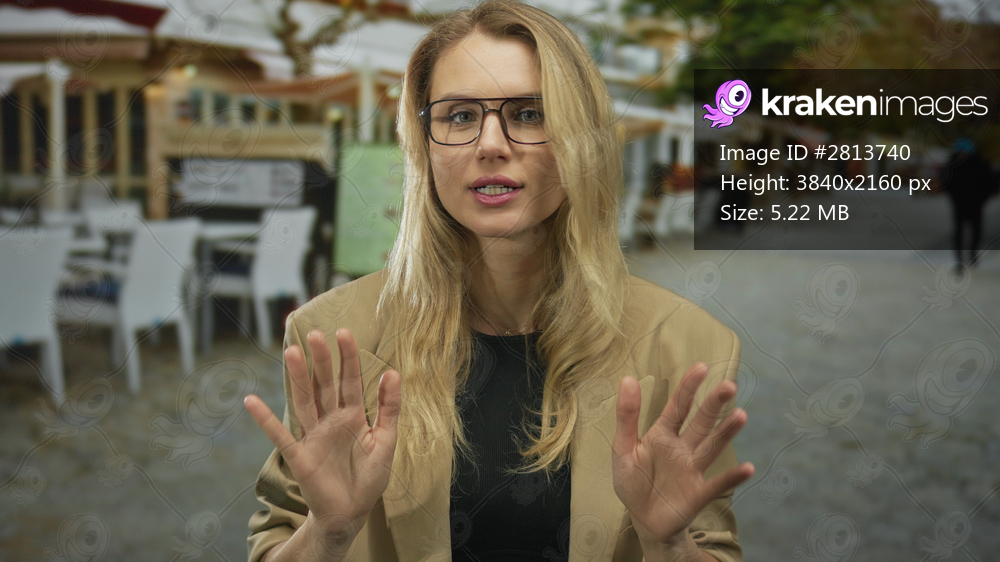 Woman gesturing calmly on a city street terrace in an outdoor restaurant setting wearing glasses and a beige blazer with blonde hair.