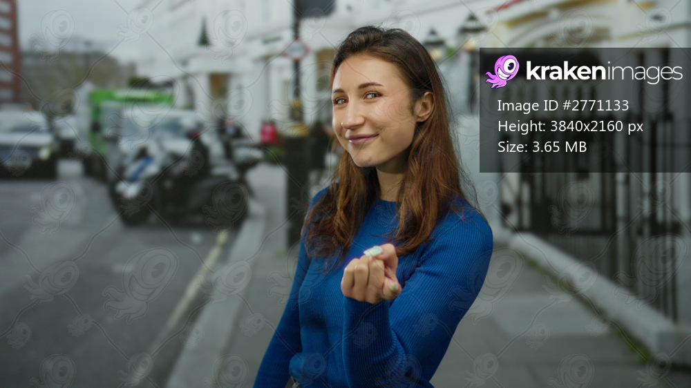 Woman gesturing come with finger on urban city street wearing blue sweater while smiling confidently outdoors in vibrant setting captured during the day. - Kraken Images
