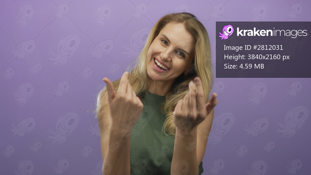 Woman gesturing come with hands against purple background, smiling and inviting with inviting gesture, blonde hair, wearing green clothing, isolated in studio. - Kraken Images