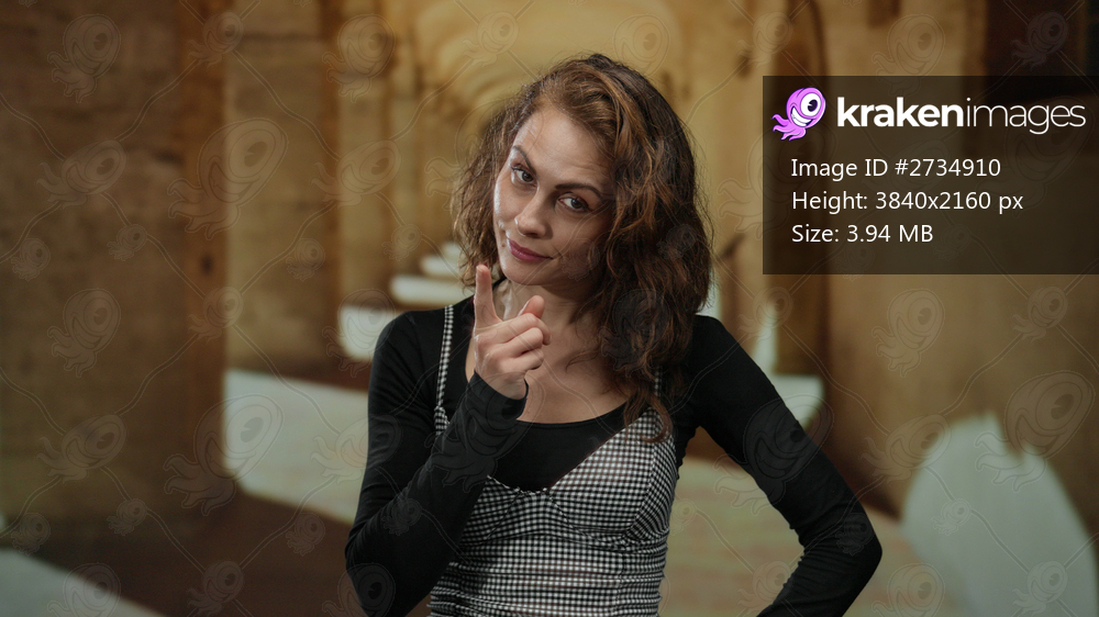 Woman gesturing confidently in an ancient university hallway with arched stone architecture, evoking historical academia ambiance.