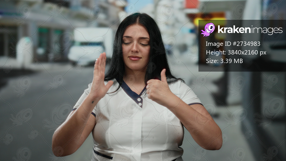 Woman gesturing confidently outdoors on city street, showcasing diversity and body positivity while wearing casual attire, blending seamlessly with urban environment. - Kraken Images