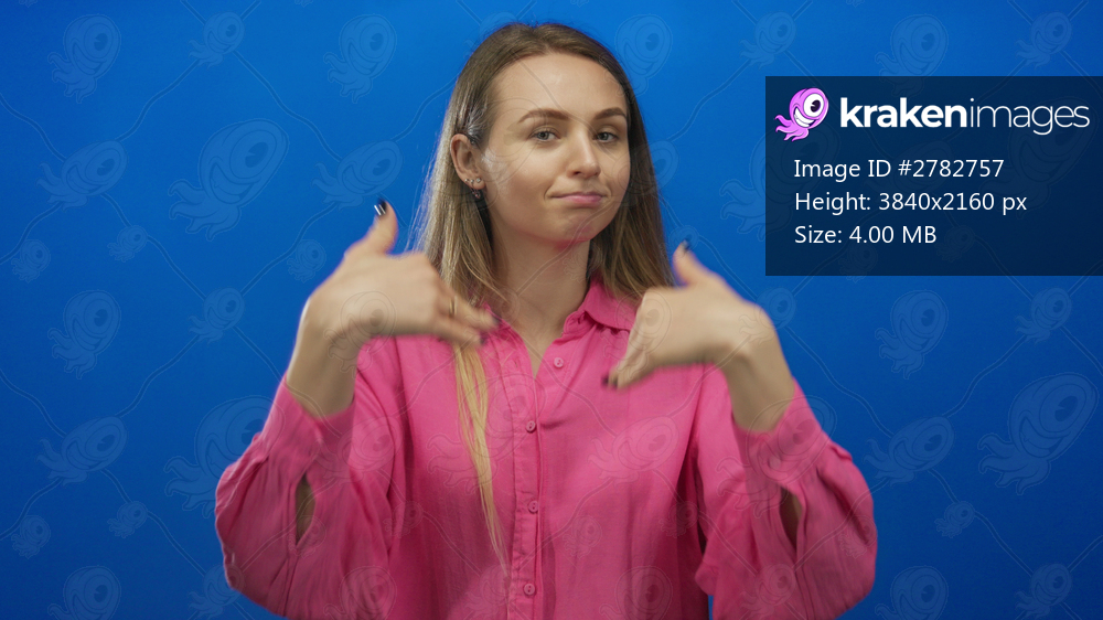Woman gesturing confidently over an isolated blue background, wearing a bright pink shirt, suggesting invitation or welcome with outstretched arms and a friendly expression. - Kraken Images