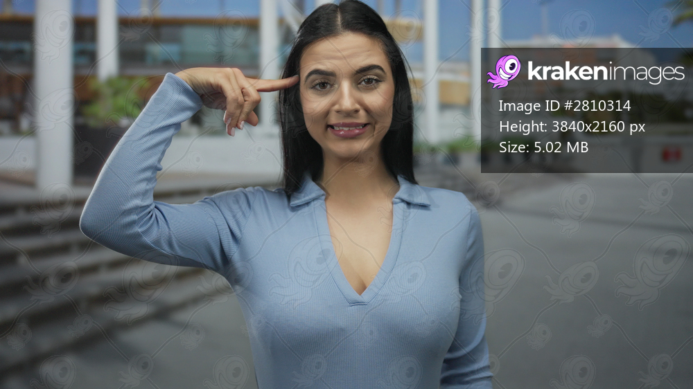 Woman gesturing crazy outside on a street, expressing humor and confusion in a casual blue shirt, capturing a playful moment outdoors.