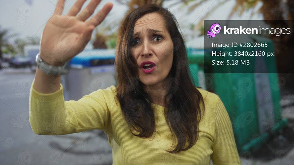 Woman gesturing energetically outdoors near street recycling containers under palm trees, wearing yellow sweater, with long hair, conveying emotion on sunny day. - Kraken Images