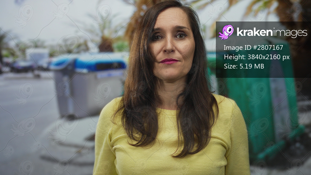 Woman gesturing energetically outdoors near street recycling containers under palm trees, wearing yellow sweater, with long hair, conveying emotion on sunny day. - Kraken Images