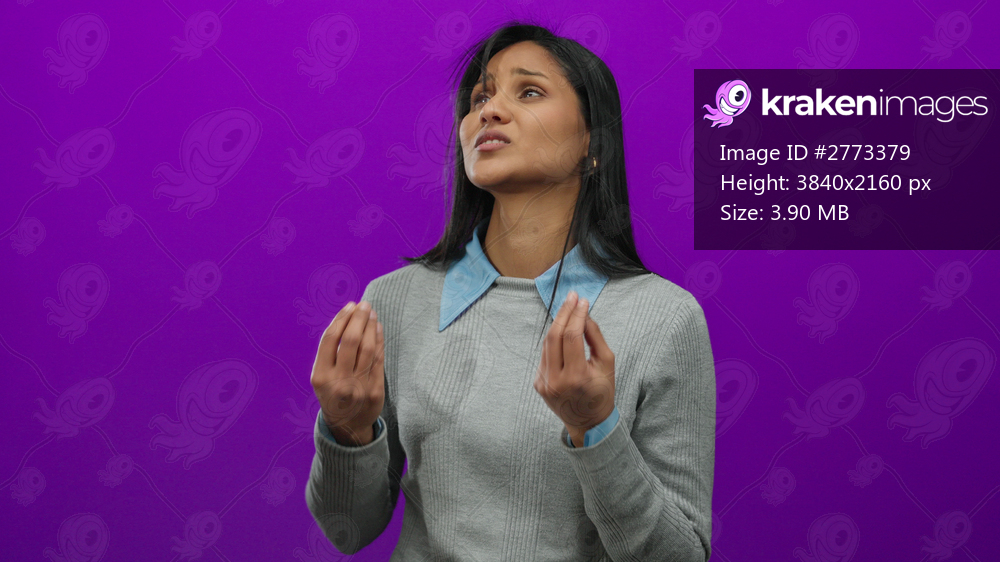 Woman gesturing expressively against a vibrant purple backdrop wearing a gray sweater and blue-collared shirt showcasing emotion and style isolated over a solid background. - Kraken Images