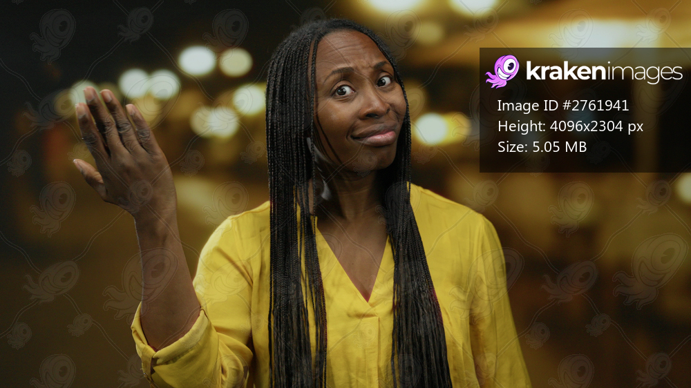 Woman gesturing expressively on a city street at night, wearing a yellow shirt, with long hair, conveying emotion in an urban setting with blurred streetlights. - Kraken Images