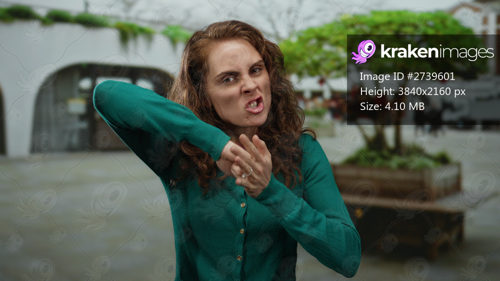 Woman gesturing expressively on urban street with modern architecture in background during daytime.