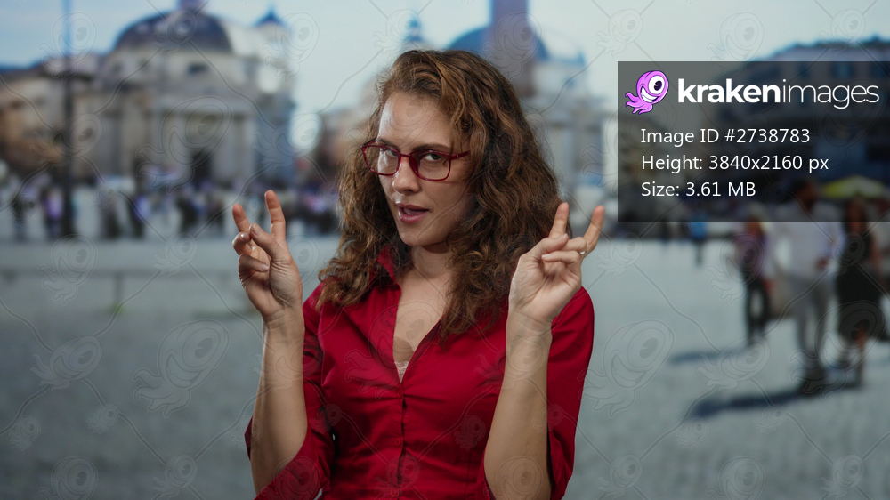 Woman gesturing with fingers standing in vatican city square with blurred background, wearing red shirt and glasses, capturing vibrant urban life outdoors. - Kraken Images