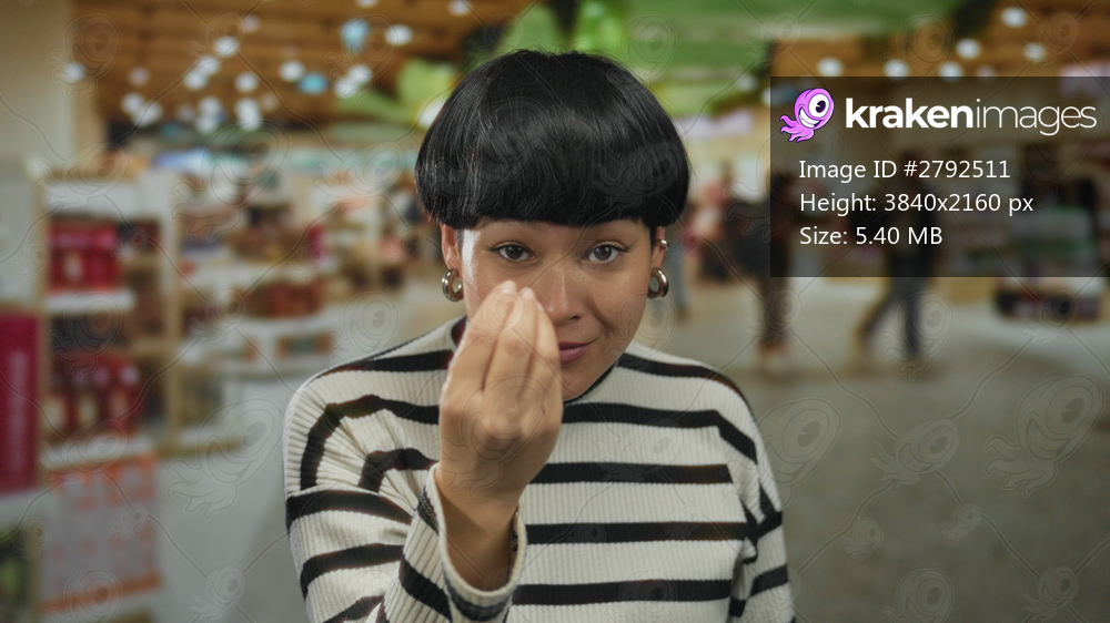 Woman gesturing with hand in busy airport indoor setting, young asian with short hair wearing striped shirt, emphasizing communication and travel ambiance. - Kraken Images