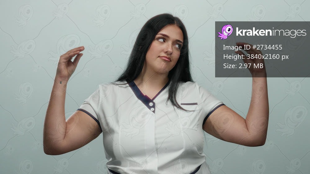 Woman gesturing with hands against white background showcasing expressive communication through body language in isolated scene.