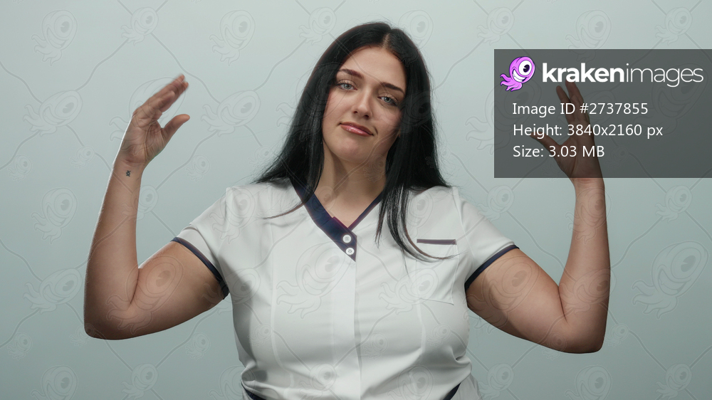 Woman gesturing with hands against white background showcasing expressive communication through body language in isolated scene.