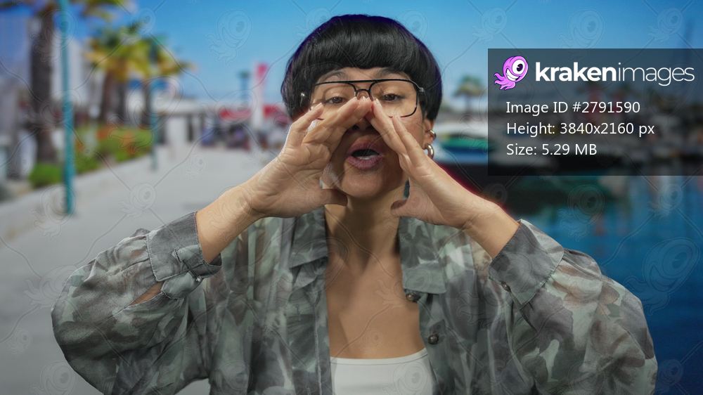 Woman gesturing with hands at seaside port with boats under clear blue sky, wearing glasses and a camo jacket, showcasing an expressive moment outdoors. - Kraken Images