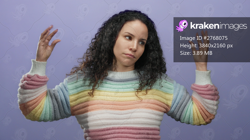 Woman gesturing with hands in colorful sweater against isolated purple wall, exuding expressive and thoughtful vibe distinctively capturing hispanic identity and emotion. - Kraken Images