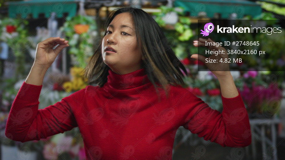 Woman gesturing with hands in vibrant flower shop outdoors, wearing red sweater, surrounded by colorful blooms, capturing lively essence of young female in market setting. - Kraken Images