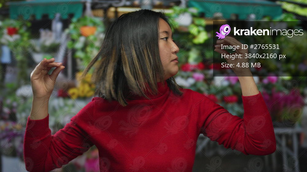 Woman gesturing with hands in vibrant flower shop outdoors, wearing red sweater, surrounded by colorful blooms, capturing lively essence of young female in market setting. - Kraken Images