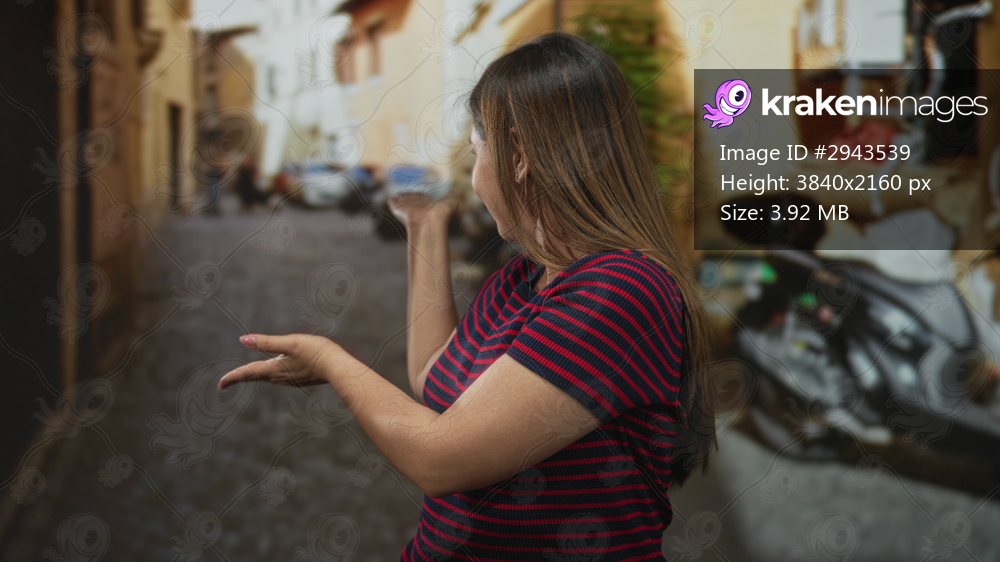Woman gesturing with hands on a narrow cobbled street beside a parked scooter; curiosity exploration travel.