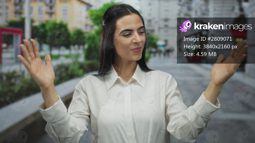 Woman gesturing with hands on outdoor street in urban setting showcasing joyful expression and natural beauty under daylight surroundings personifies youthful energy and confidence. - Kraken Images