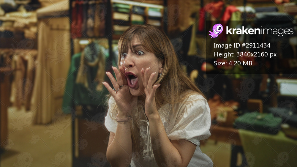 Woman gesturing with hands and open mouth amid clothing racks inside a retail building; surprise curiosity.