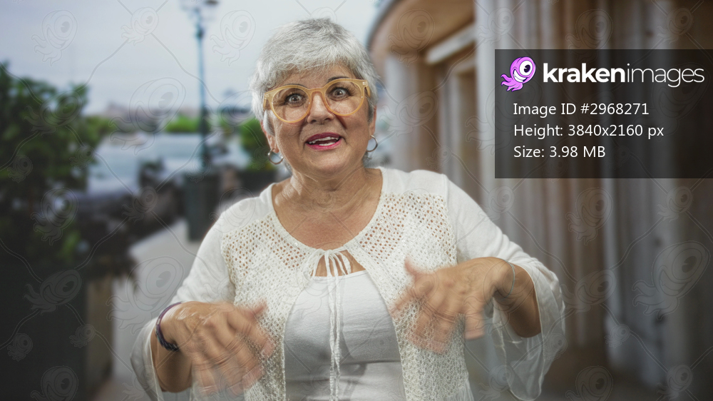 Woman gesturing hands with open mouth and smiling, wearing glasses on a street with building columns; joyful surprise.