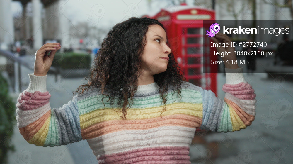 Woman gesturing with hands outside near red phone booth and wearing colorful sweater on city street with blurred pedestrians and trees in the background. - Kraken Images