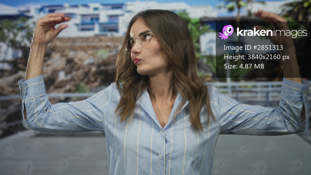 Woman gesturing with hands and raised palms on a street with visible building facades and boardwalk; animated conversation.