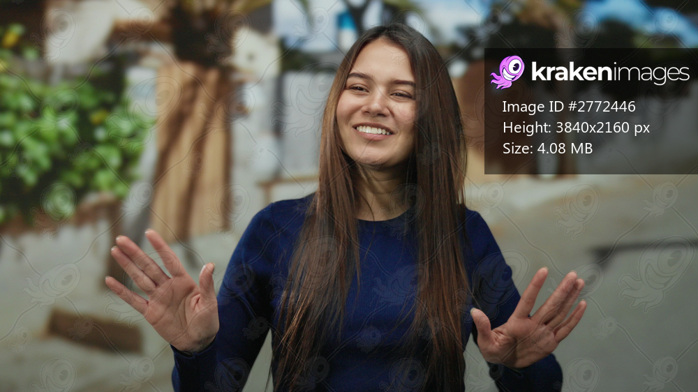 Woman gesturing happily on a sunny street, showcasing expressive communication with her hands and long hair in an urban outdoor setting with blurred trees and background. - Kraken Images