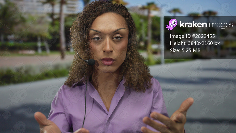 Woman gesturing with headset microphone and raised hands on city street in daylight delivering message; determination communication empowerment.