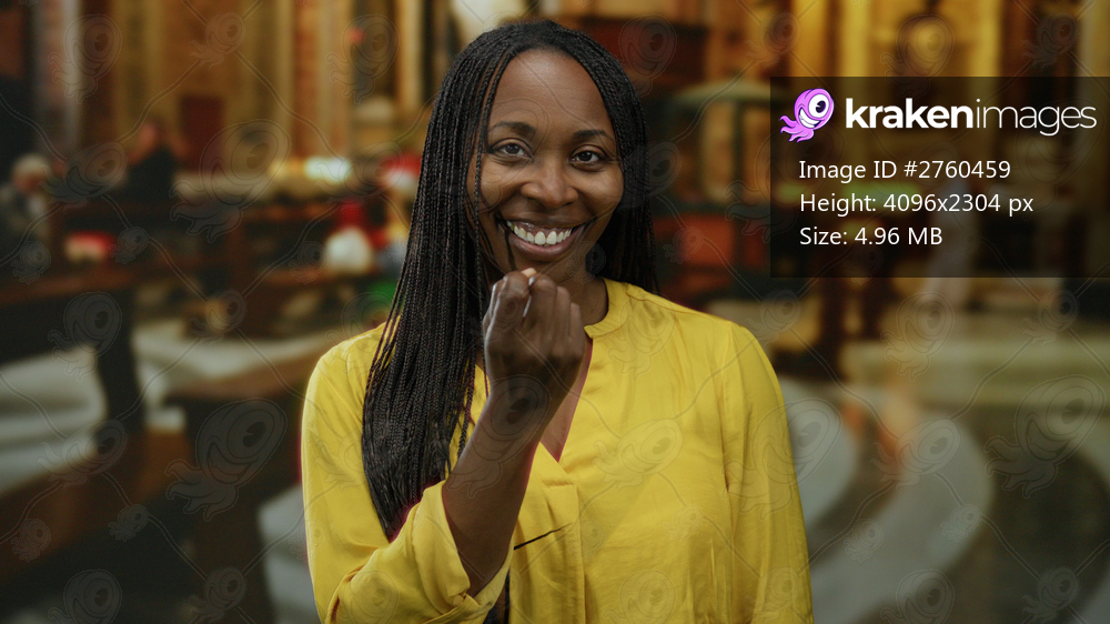 Woman gesturing in a church setting with yellow blouse, displaying friendliness and approachability indoors with a warm smile and braided hair.