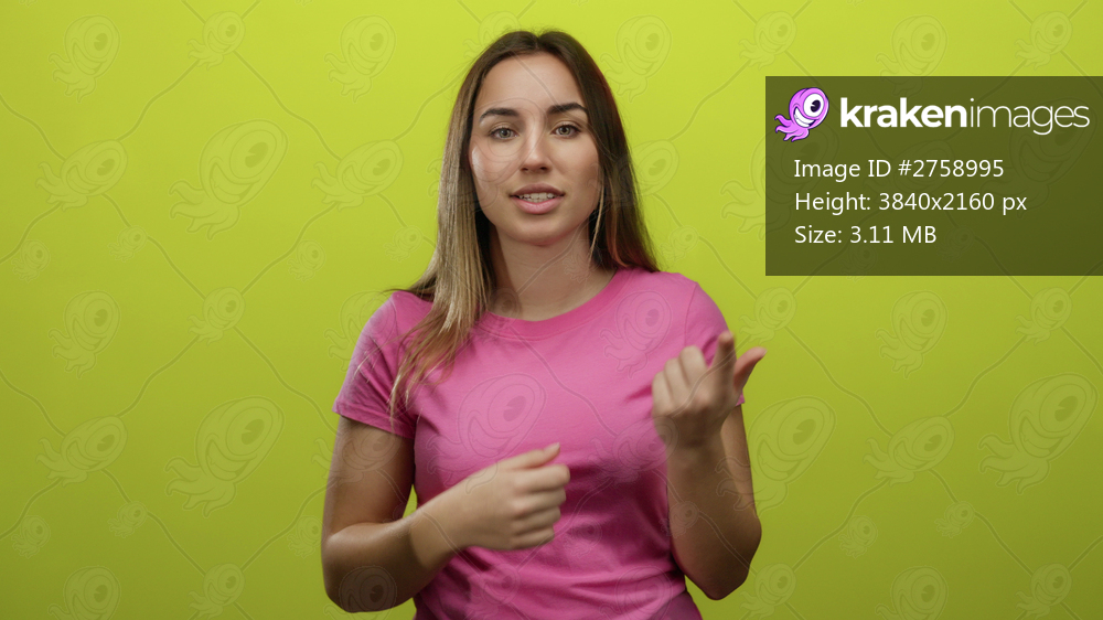 Woman gesturing in a pink shirt against a vibrant yellow background, expressing emotion with her hands, conveying a message or instruction in an isolated studio setting. - Kraken Images