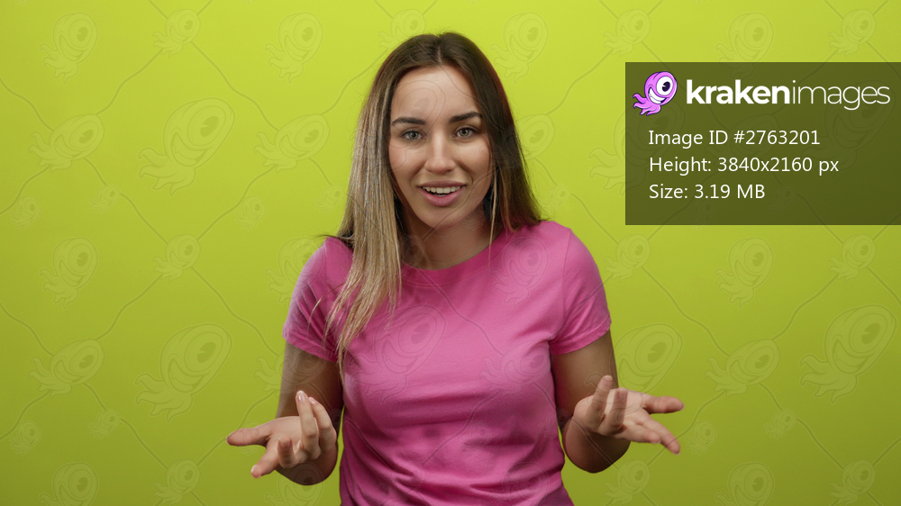 Woman gesturing in a pink shirt against a vibrant yellow background, expressing emotion with her hands, conveying a message or instruction in an isolated studio setting. - Kraken Images