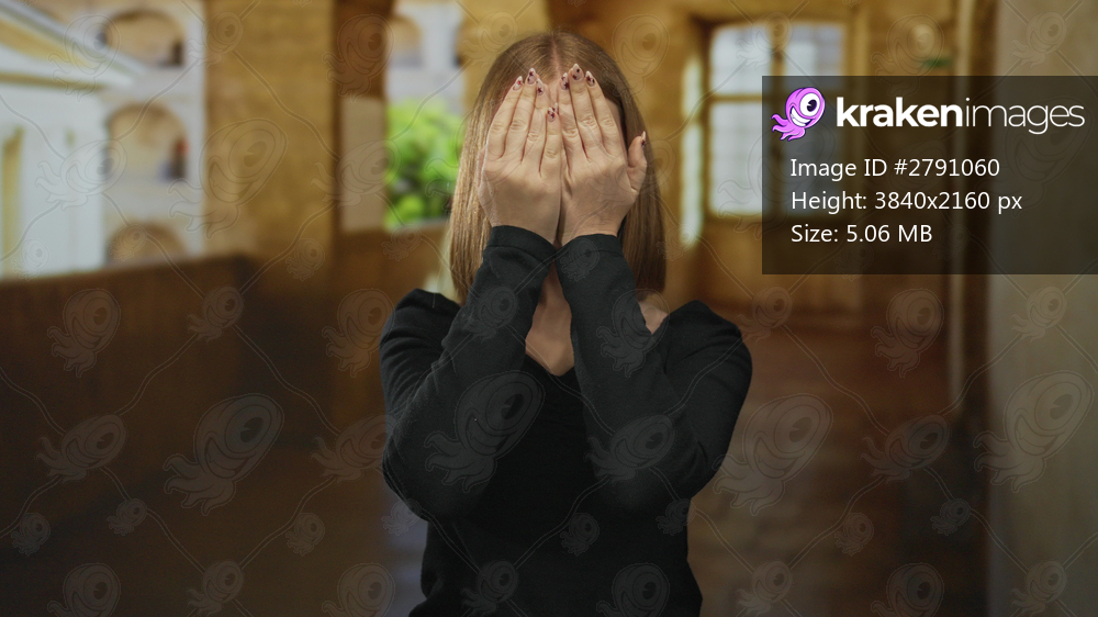 Woman gesturing in an old town street with windows and arches in the background, featuring a young blonde woman outdoors displaying expressive hand movements. - Kraken Images