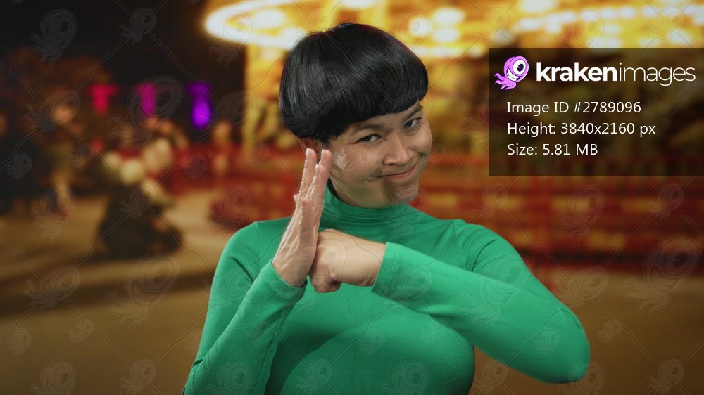 Woman gesturing in green sweater at lively night fair with bright lights and blurred people in the background creating a vibrant outdoor atmosphere.