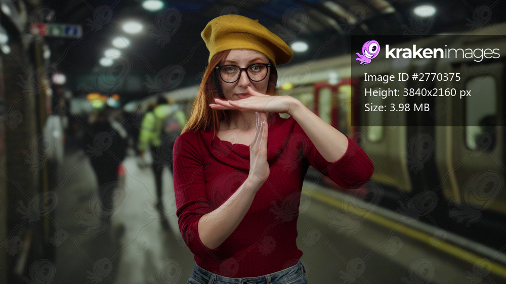 Woman gesturing indoors at a train station wearing a yellow beret and red sweater with people in the background.