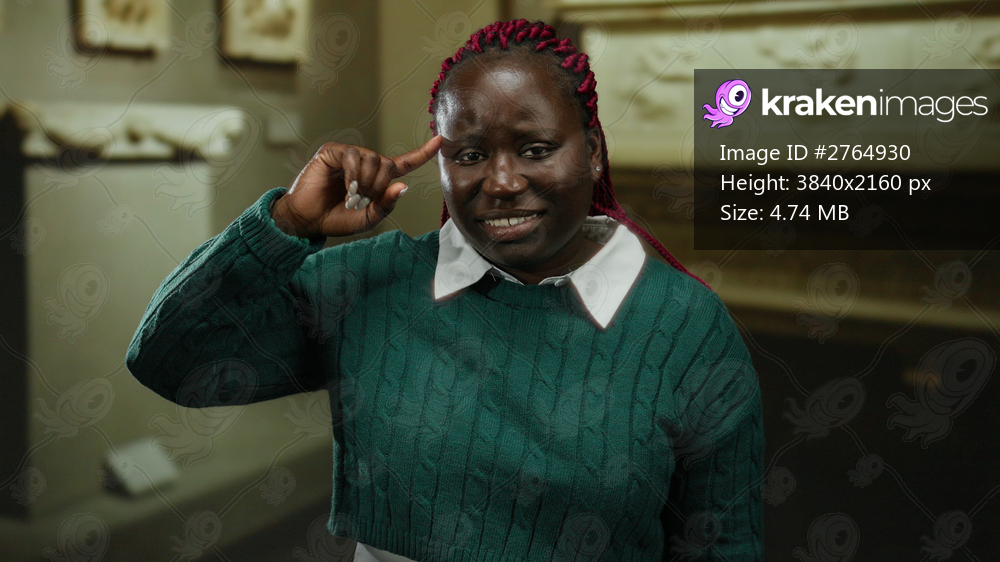 Woman gesturing inside a museum, expressing a playful sense of madness, surrounded by ancient artifacts, with a thoughtful expression and casual attire, conveying a whimsical atmosphere. - Kraken Images