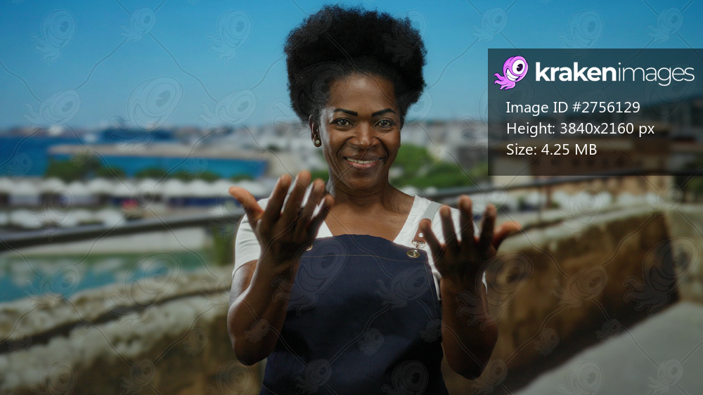 Woman gesturing invitingly with hands on a sunny seaside promenade, wearing an apron, with the ocean and cityscape in the background, creating an inviting outdoor atmosphere. - Kraken Images
