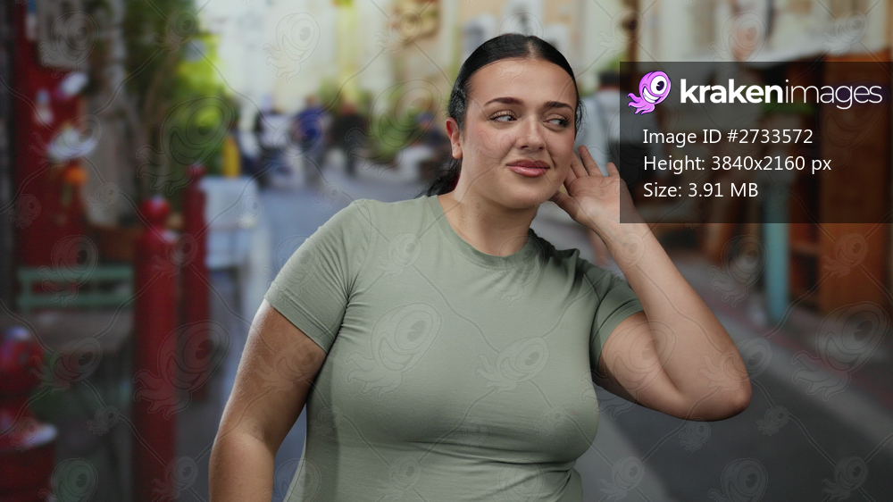 Woman gesturing listening on outdoor city street with friendly expression in urban environment, showcasing plus size fashion and body positivity.