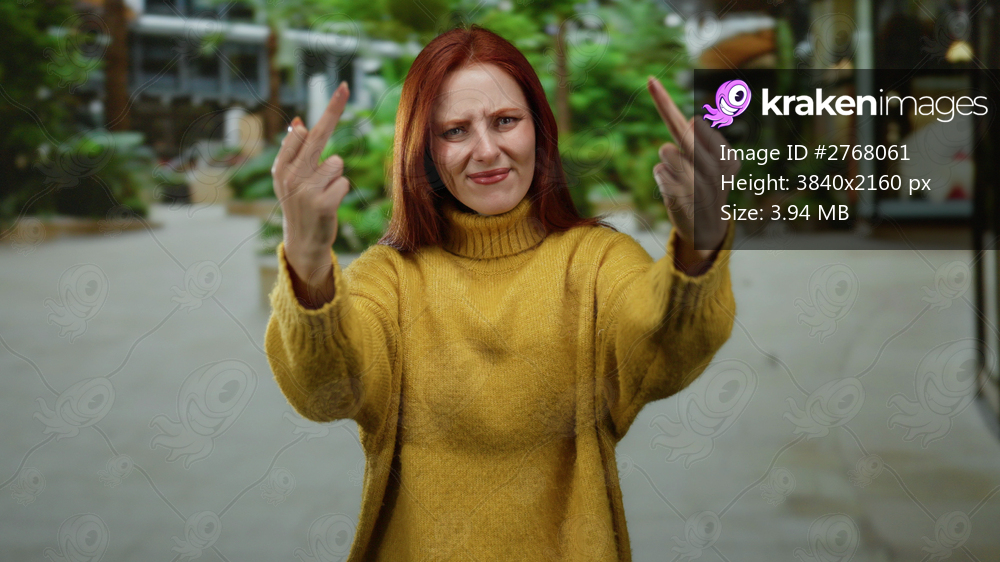 Woman gesturing with middle fingers in an urban street, wearing a yellow sweater, red hair framing a confident expression, blurred city background outside, emphasizing attitude. - Kraken Images